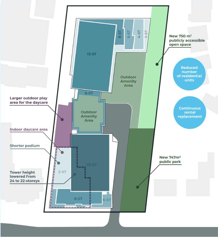 Our vision is to add a 22-storey residential building with 487 residential units, which includes 35 rental replacement units for existing residents.